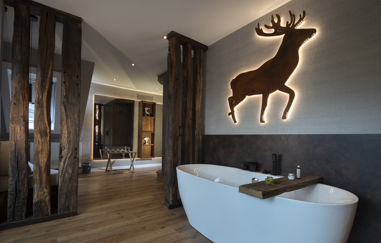 Holz, kräftige und natürliche Farben, widerstandfähige Wollstoffe wie Loden kombinieren wir gern mit modernen Akzenten wie Fototapeten oder großen, hinterleuchteten Metall-Elementen.